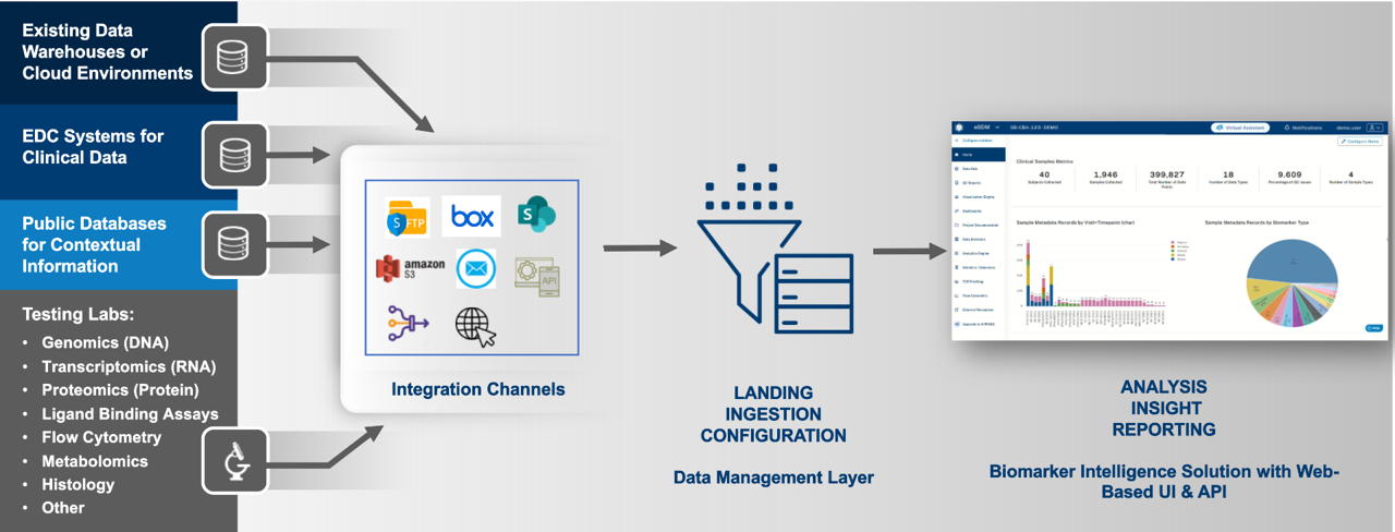 Figure 1. Overview of the Biomarker Intelligence solution as deployed across 5 clinical studies. Multiple data types were automatically loaded into the Precision Medicine Platform via various integration channels as required. After indexing, quality control (QC), and mapping in the landing, ingestion, and configuration layers of the Precision Medicine Platform, client teams could interrogate the data ecosystem using both the web interface and API access.